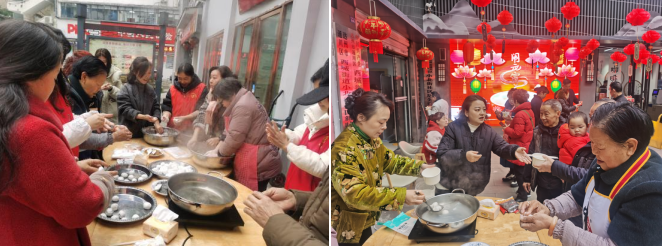 “汤圆”与“团圆”二字谐音,象征着团团圆圆,在元宵节吃上一碗元宵,代表着新的一年家庭和和美美、日子越过越红火。“快来吃元宵呀,热乎的元宵嘞!”和糯米粉、拌馅料、分装摆盘……大家一边包一边煮,热火朝天地张罗着,一个个小巧玲珑、做工精致的元宵煮好,不断向来往的居民分发,将一份份温暖和祝福传递给大家。大家猜着灯谜,吃着元宵,脸上流露出幸福的笑容。