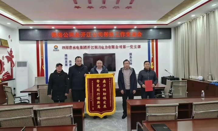 1月27日,四川水电集团德格格萨尔电力有限公司党委委员、副总经理王中奎一行专程赴开江明月电力有限公司,就前期帮扶工作开展座谈交流,并向开江公司赠送“鼎力相助促发展、擎光同行谱新篇”锦旗,表达诚挚谢意。开江公司党委书记、董事长蒲志安及公司相关领导、部门负责人、帮扶工作人员参加座谈。