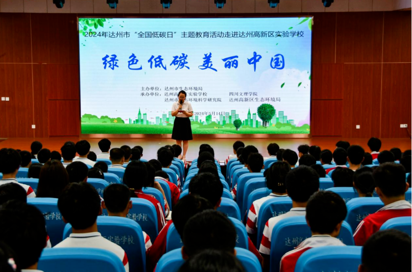 为推动形成绿色低碳的生产方式和生活方式,广泛开展节能降碳宣传教育,提高学生们的环保意识,倡导低碳生活方式,5月14日,由达州市生态环境局主办,四川文理学院、达州市生态环境科学研究院、达州市高新区生态环境局、达州高新区实验学校承办的以“绿色低碳 美丽中国”为主题的“全国低碳日”教育活动走进了达州高新区实验学校。 活动中,四川文理学院2023级化学与化工学院周正豪从低碳设立的背景、什么是低碳生活、为什么要践行低碳生活、该怎样践行低碳生活四个方面深入讲解了低碳相关生活知识,倡导同学们积极践行绿色低碳生活方式,并进行了低碳知识问答。活动现场,同学们也是踊跃提问,在积极的互动中增加了对绿色低碳生活的理解。
