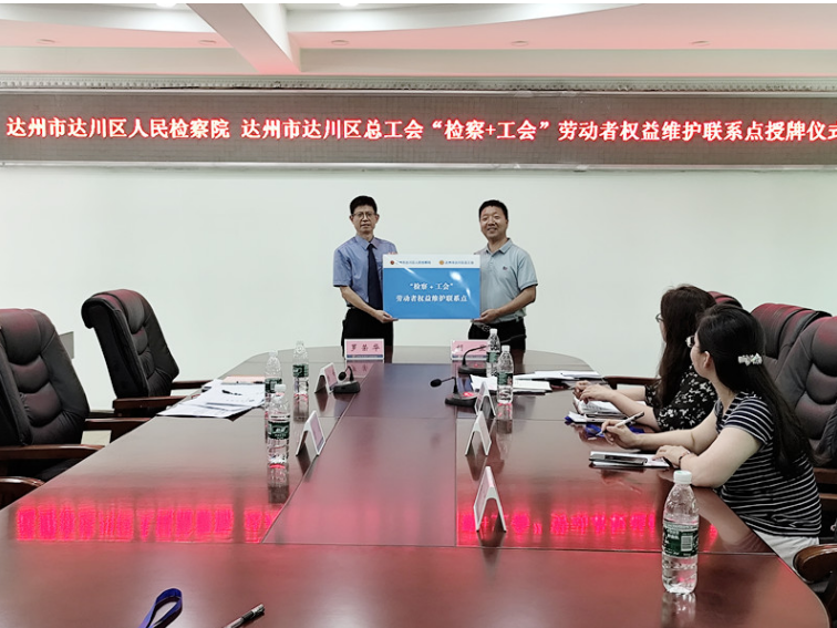 5月23日,达川区总工会在区人民检察院设立“检察+工会”劳动者权益维护联系点,并进行授牌。这是四川《检工协同推进运用“一函两书”制度加强劳动者权益保障工作的意见(试行)的通知》下发后,我市首个人民检察院“检察+工会”劳动者权益维护联系点,也标志着劳动者权益保障工作新模式的正式运行。