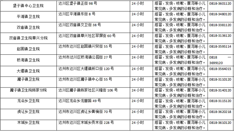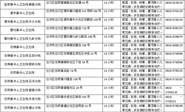 达州市达川区基层医疗卫生机构提供儿科服务名单