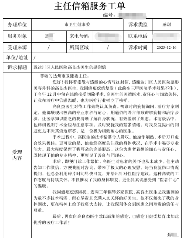 “高医生不仅医术精湛,更让我感受到了家人般的温暖。”近日,达川区卫生健康局收到一封市卫健委主任信箱转来的特殊工单——患者聂女士发来的感谢信,信中真挚赞扬了达川区人民医院整形美容外科高良杰医生。这封感谢信,是我区持续深化医德医风建设、提升医疗服务温度的生动写照。 聂女士因疤痕疙瘩复发,曾辗转多家医院求医。今年12月,她在达川区人民医院就诊时,高良杰医生从初诊沟通、方案制定,到术中精细操作、最大限度保留耳部形态,再到术后通过微信提供持续专业指导和心理支持,全程展现了精湛技术、高度责任与深厚人文关怀,帮助她顺利康复。患者在信中动情写道:“他不仅解决了我的身体困扰,更在精神上给予我莫大支持。” 类似的暖心故事,也在基层医疗机构悄然上演。近日,三里坪街道社区卫生服务中心综合三科护理部收到一面写有“护患一家亲 白衣秉丹心”的锦旗,赠送者是刚出院的75岁患者何爷爷及其家属。何爷爷因消化道出血入院,治疗期间,护理团队不仅严密监测病情、精准执行医嘱,更在无数个夜晚给予他耐心安抚与细致照料,康复阶段还贴心指导饮食、协助按摩,促进功能恢复。家属紧握护士长的手,连声道谢:“不是亲人,胜似亲人!”这面锦旗,不仅是对护理团队的肯定,更是“有时去治愈,常常去帮助,总是去安慰”医学人文精神的真实写照。 近年来,达川区卫生健康局坚持以人民健康为中心,将医德医风建设贯穿医疗服务管理全过程,通过强化职业道德教育、选树宣传先进典型、完善监督评价机制等一系列举措,引导广大医务人员弘扬崇高职业精神,践行“以患者为中心”的服务理念。全区各医疗机构积极响应,将人文关怀融入诊疗各环节,涌现出一批像高良杰医生这样技术优、服务暖、口碑好的骨干医师,也锻造出如三里坪街道社区卫生服务中心护理团队这般贴心周到、充满温情的基层服务力量,患者就医获得感、满意度持续提升。 医德医风建设是医疗卫生事业高质量发展的根基。下一步,区卫生健康局将继续发挥行业主管部门作用,以提升群众满意度为导向,深入推广此类优质服务模式与经验,强化正面引领与长效机制建设,同时加强行业监督与指导,推动全区医疗机构持续改进服务,努力为人民群众提供更加安全、优质、高效、有温度的卫生健康服务。