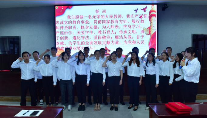 学校教务处开展了“新进教师宣誓仪式”。21名新进入该校的老师,身着正装,紧握右拳,用铿锵的誓言表达了要为教育事业奉献一生的决心。