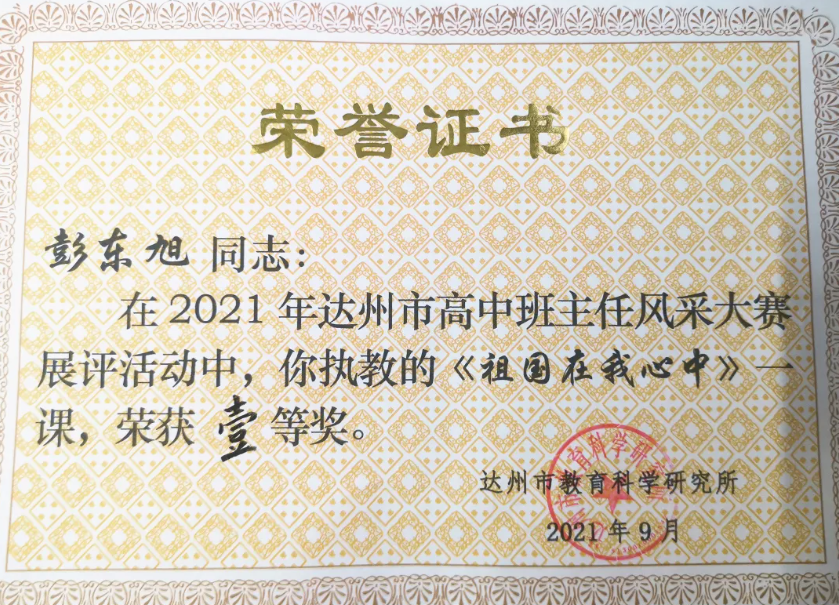 四川先锋网消息(吴发明)9月16日至 9月17日,全市2021年高中班主任风采展评暨教学研讨活动在达州中学顺利举行。达州中学高二年级彭东旭老师参加了此次展评活动并荣获一等奖第一名,将代表达州市参加四川省班主任风采展评大赛。