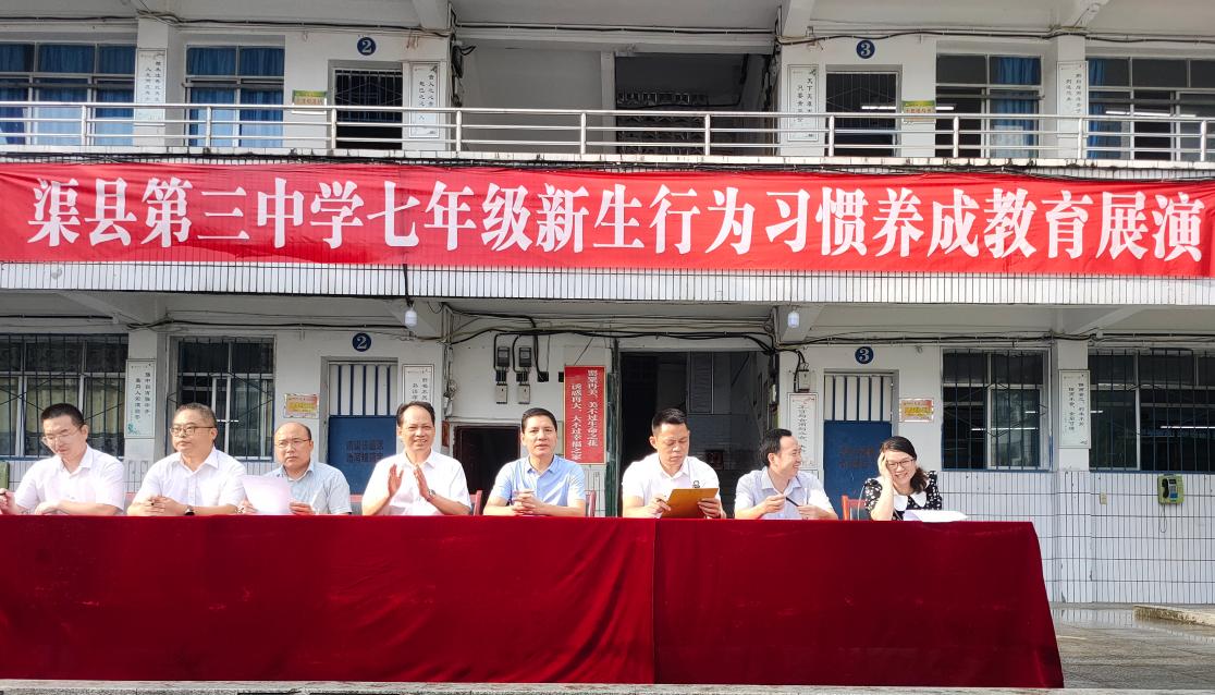 四川先锋网消息(范超)9月13日上午,渠县第三中学举行七年级新生行为习惯养成教育成果展演,总支书记李明月检阅并指导展演,校长蒋涛检阅指导展演并对展演活动进行总结,德育处主任刘万全主持展演。