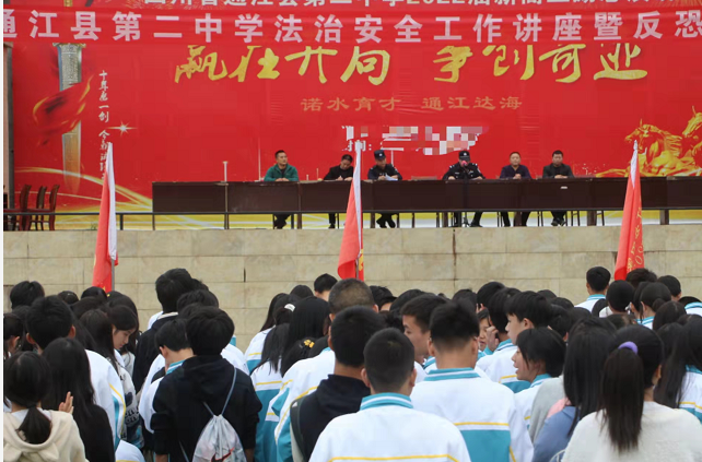为深入学习习近平法治思想,不断提升全校师生法治意识和法治素养,贯彻落实依法治校,近日,通江县第二中学在运动场举行了法治安全教育讲座。