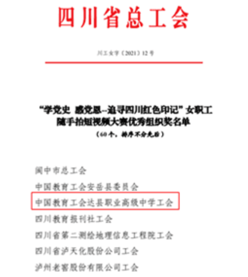 近日,四川省总工会组织的“‘学党史 感党恩——追寻红色印迹’女职工随手拍短视频大赛”结果正式揭晓,中国教育工委达县职业高级中学工会获得“优秀组织奖”。