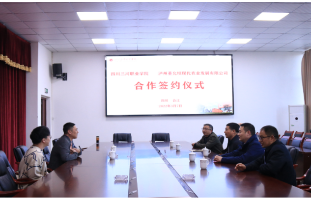 3月7日,四川三河职业学院与泸州董允坝现代农业发展有限公司校企合作签约仪式在学校二会议室举行。泸州董允坝现代农业发展有限公司董事长王黔、公司运营部经理文亚宇,少岷教育集团董事长王忠平、三河职业学院执行董事王文潇、集团副总裁胡怀志、三河职业学院副校长蒲先祥和现代农业技术学院院长徐恢仲出席签约仪式。