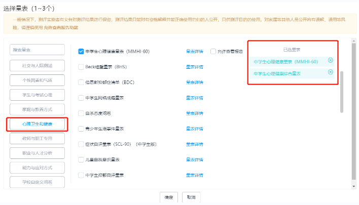 高中年级采用《中学生心理健康量表MHT》,主要针对强迫症状、偏执、敌对、人际关系敏感、抑郁、焦虑、学习压力感、适应不良、情绪不稳定、心理不平衡等进行摸排。初中年级采用《中学生心理健康综合量表》,主要针对学生抑郁、适应性、学习压力感、人际焦虑、冲动、厌世和网络成瘾等进行摸排。根据量表的综合评定,全面了解学生心理健康程度,该量表是评估学生心理健康的良好工具。