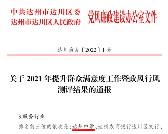 四川先锋网消息(曾国峰 吴发明)日前,达川区2021年提升群众满意度工作暨政风行风测评结果公布,达州中学位列服务行业类第一,实现连续五年同类排名全区榜首。