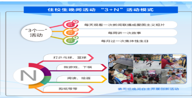 为了认真落实“双减”工作,丰富住校生课余生活,学校设立了住校生晚间活动室,开展了晚间“3+N”活动模式。即:“3个一活动”是指每天观看一次新闻联播或爱国主义短片,培养学生听、看得能力及爱国的情怀;每周讲一次故事,培养学生说的能力;每月过一次集体性生日,让学生感受到家的温暖;“N”是指值周组自主创新活动(内容:打乒乓球、打篮球、做游戏、绘画、书法、课外阅读等)。