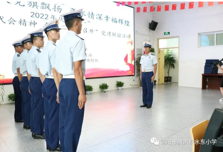 最后,全体舞动红旗,高唱《歌唱祖国》,斗志更加昂扬。党旗飘扬青春绽放,鱼水情深幸福辉煌,水东小学与消防站联合开展的2022年庆“七·一”暨“学习党代会精神 .喜迎二十大召开”主题党日联谊活动圆满落下帷幕。