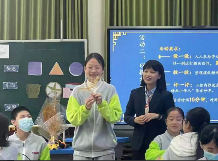 决赛现场,执教者以课堂教学为主阵地,以培养学生劳动素养为着力点展开。刘丽老师执教《汉州糖画》,整节课教学思路清晰,讲解、示范糖画的步骤明确,小组合作井然有序。学生通过学习、体验糖画的制作过程,了解了非遗传承人的故事,感受到非遗的魅力,更理解了“三百六十行,行行出状元”的道理,培养学生劳动观念,弘扬精益求精、追求卓越的“工匠精神”也融入其间。曾莎老师执教《劳动技能课——包饺子》,她先通过提问,观看热点新闻,激发学生的参与兴趣;接着,通过“讲解+示范”展示包饺子的要领,并随即组织学生参与体验。学生根据要领大显身手,做出了各具特色的饺子:柳叶型、元宝型等形状的饺子“横空出世”。曾莎老师逐桌观看、点评,并适时融入珍惜劳动成果、争当“光盘达人”、自觉文明就餐等教育。郑玉娇老师敬献的《衍纸书签》一课,她展示、组织学生欣赏精美的衍纸书签作品,讲解书签及衍纸的历史。由于学生对衍纸书签相对陌生,为此,她通过视频演示、步骤讲解,引导教学生了解衍纸装饰书签的基本技法。学生从不会到会,再到经过自己设计、制作,一件件“个性化”的作品经学生的巧手被创作出来,并被学生兴奋地贴上黑板进行公开展示。“我体会到,劳动不仅可以表达美、创造美,还能创造特殊的价值。”一名学生在劳动过程的愉悦感和成功感写满脸庞。