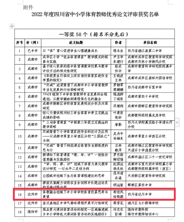 喜报‖达川中学两名教师在“2022年四川省中小学体育教师优秀论文”中获得一等奖