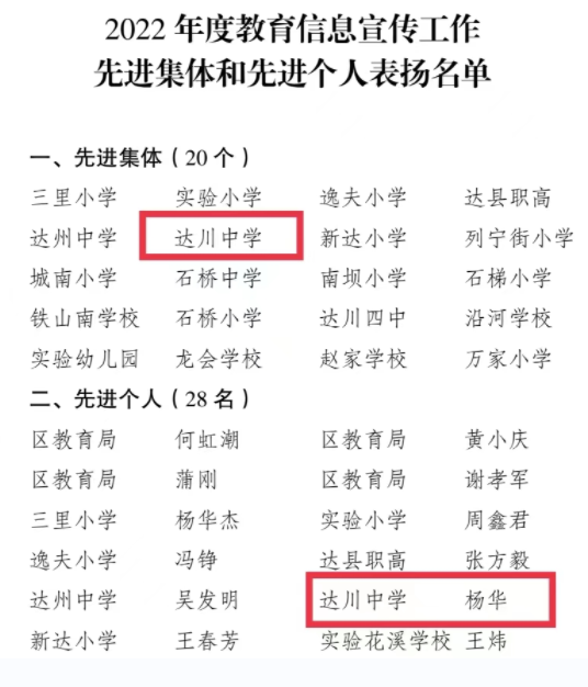 2月15日,达川区教育局对2022年度教育信息宣传工作先进集体和先进个人进行了表彰,达川中学获“教育信息宣传工作先进集体”称号,杨华老师荣获“达川区2022年度教育信息宣传先进个人”。