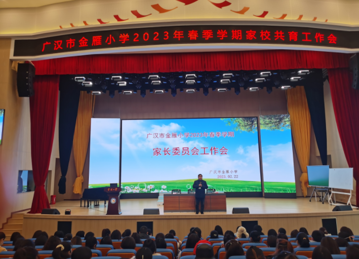 为充分发挥家委会的纽带作用,促进家校沟通,2月22日下午,广汉市金雁小学召开2023年春季学期家长委员会工作会议,邀请家委会代表到校共商家校共育工作。会议在金彩彩艺术中心演播大厅举行,金雁小学政教处主任曾生富主持,各班家委会成员参加。