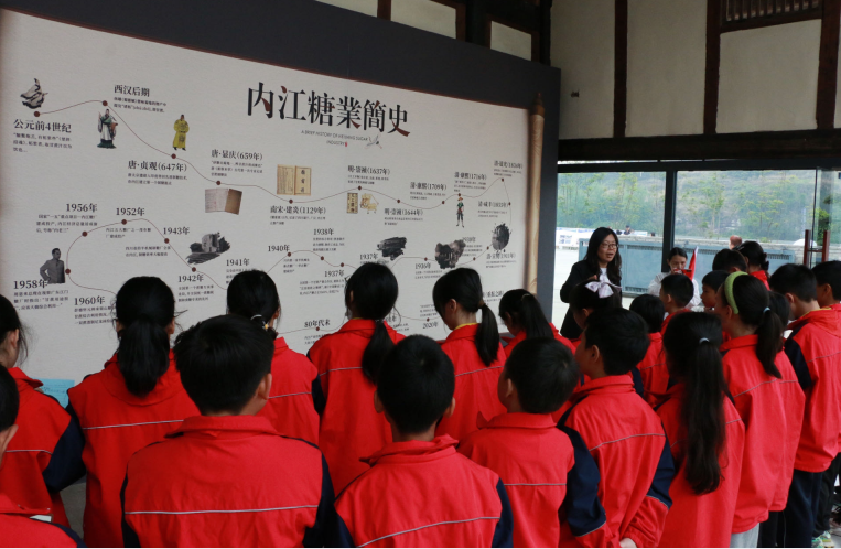 为保证此次研学活动的顺利开展,学校大队部制定出周密、详实的出行方案和安全预案。到达目的地后,学校主要负责人带领同学们来到内江糖业故事馆,向大家重点介绍了清康熙年间,先辈曾达一背两捆甘蔗入川,带动本地制糖业在内江辉煌发展的那段历史。同学们来到文化广场上的非遗作品展览处,根雕、蛋壳画、烙印画、刺绣等琳琅满目的非遗作品让孩子们目不暇接,在工作人员的指导下,同学们还动手刺绣、绘制蛋壳画,体验劳动之美。同学们来到手工制作区体验传统手工熬糖工艺。一锅锅的甘蔗汁随着温度的不断升高,在同学们的不断搅拌下慢慢变得粘稠,大约30分钟后,空气中弥漫着清甜的甘蔗气息,同学们的脸上都洋溢着灿烂的笑容....