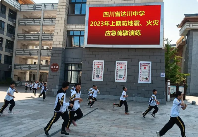 近日,四川省达川中学在华蜀和三里两个校区分别举行了防地震火灾应急疏散演练。