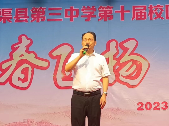 (学校党委书记蒋涛宣布文艺展演开始) 渠县第三中学党委书记蒋涛参加晚会并宣布文艺展演正式开始,渠县第三中学党委副书记、校长郑文东为文艺晚会致词,他鼓励同学们要热爱艺术,用艺术陶冶情操,用艺术启迪智慧,并祝演出圆满成功。