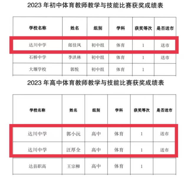 近日,达川区教育局公布了获奖情况。其中,达川中学体育学科初中组参赛老师郎佳凤获得一等奖,高中组参赛老师汪厚全、郭小沅老师分别获得一等奖;音乐学科初中组参赛老师周向娟获得二等奖;美术学科初中组参赛老师龚小艺获得一等奖,高中组参赛老师杨丹获得一等奖。