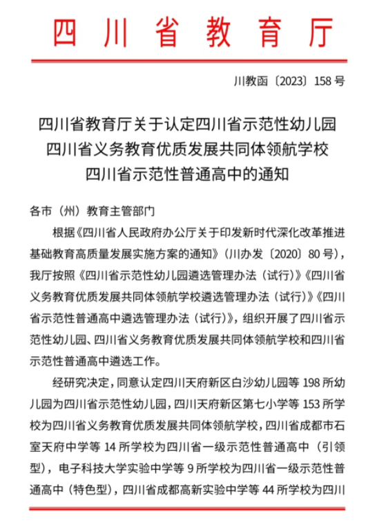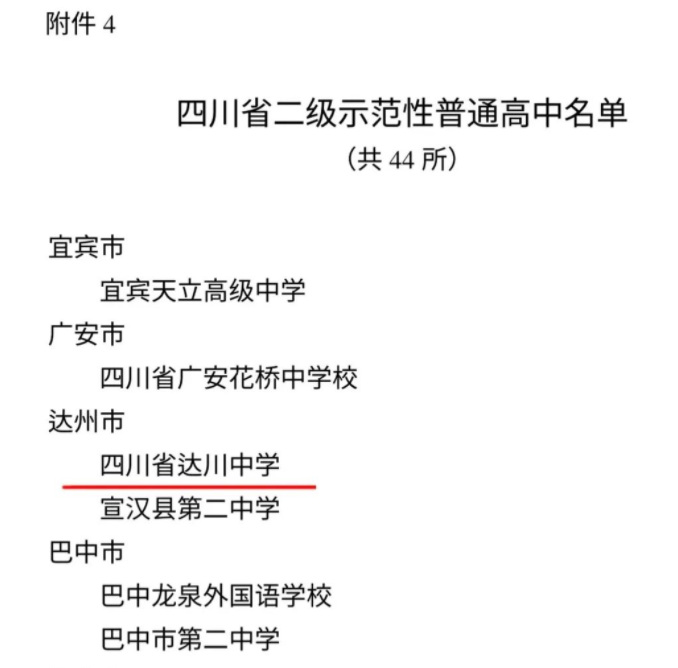 5月22日,四川省教育厅公布《关于认定四川省示范性幼儿园四川省义务教育优质发展共同体领航学校四川省示范性普通高中的通知》(川教函[2023]158号),四川省达川中学被认定为四川省二级示范性普通高中!