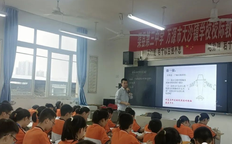 我校的英语老师陈卫珍和数学老师罗林分别上了一堂观摩课和示范课,课题分别是《Unit 8 Section B 2b》和《探索轴对称的性质》,我校两位老师以贴近生活的实际问题创设情境,激发学生的学习兴趣,营造活跃的学习氛围,课堂上,老师十分尊重学生主体性,充分调动学生积极性,实行多元化教学。随后,万源大沙学校数学教师刘桃进行探究课展示,她所授课程的内容是《平行四边形的性质》。课堂上,刘桃老师从回顾四边形的定义和性质入手,引发学生对平形四边形条件的探究,通过学生的亲身操作,充分调动学生参与的积极性,学生的学习兴趣被充分激发,教学难点在学生的动手和合作交流中被很好的突破,她向大家展示了一堂高质量的“自主、合作、探究、灵动”的数学课。