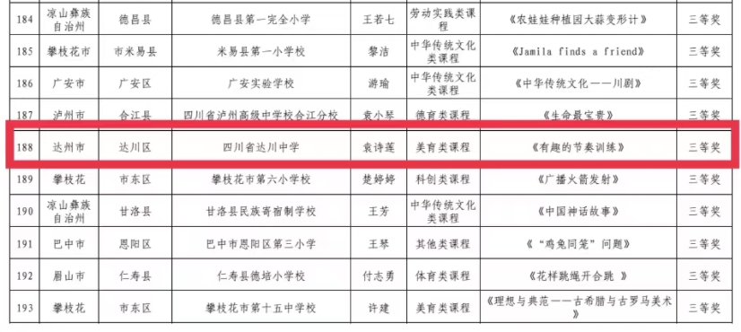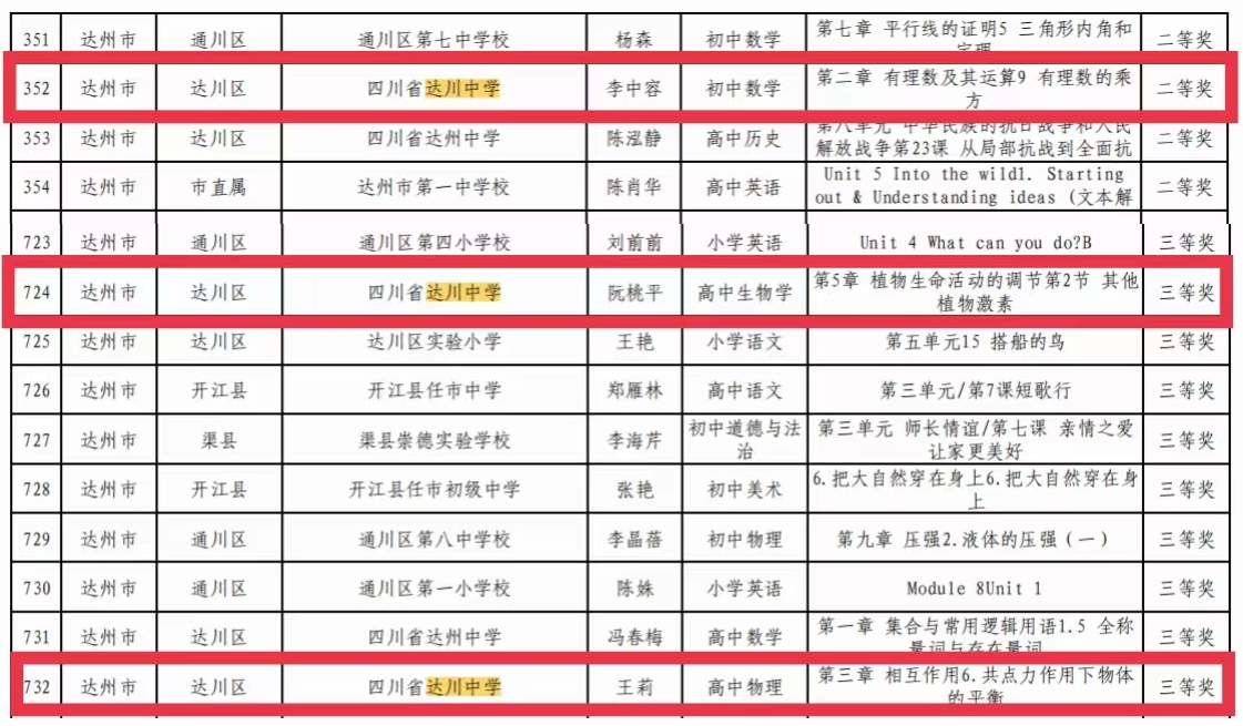 近日,四川省教育厅公示了关于2022年四川省“课堂教学大比武”暨“基础教育精品课”遴选活动获奖名单,达川中学4名教师获奖——