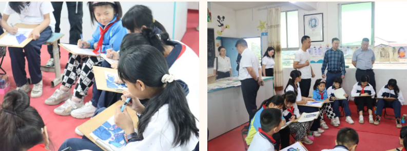 上午十点,在万家小学党支部书记、校长李浪及学校行政领导的热情接待下,工作室一行人首先来到学校美术工作室观摩教师作品、学生美术作品和学生现场静物写生。孩子们围坐一团,认真观察对方,画笔在纸上描绘,不一会,一幅幅栩栩如生的作品就呈现在大家面前,引得工作室成员频频赞许。