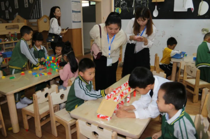 参会人员观摩了大班级幼儿搭建“家乡的桥”的自主游戏。孩子们运用生活中的材料大胆探索、合作尝试,在游戏中孩子的学习成长被看见。