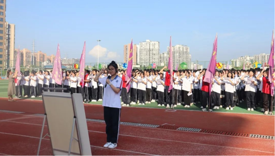随后,高三学生高举右拳,神情坚定,领誓人饱含激情,同学们齐声宣誓,表示要以百分之百的努力去迎接高三的挑战。