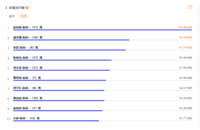 本次学习的排行榜中,彭首豪106.9小时,郝齐翔69.28小时,张震67.76小时,陈敏杰58.59小时,周文添57.95小时,曹明珠55.95小时,周宇轩54.57小时,瞿欣蕊54.24小时,袁新钞53.4小时,乐静51.77小时,在此次自主学习中看课排名年级前十,是大家学习的榜样!