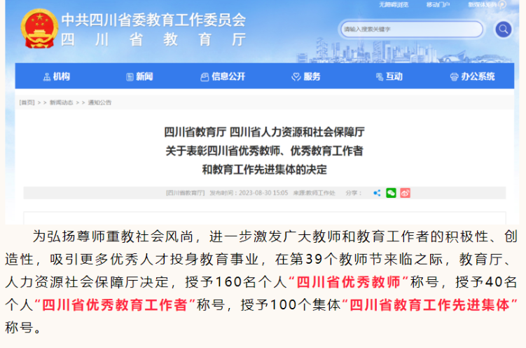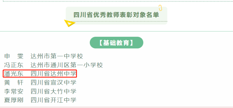 8月30日,四川省教育厅、四川省人力资源和社会保障厅发布关于表彰四川省优秀教师、优秀教育工作者和教育工作先进集体的决定。四川省达州中学潘光东老师荣获四川省“优秀教师”称号。 潘光东,中共党员,大学本科学历,高级教师,现任达州中学党委委员、副校长,达州市中学数学名教师工作室领衔人,达川区中学数学名教师工作室领衔人,先后被评为达州市骨干教师、达州市优秀教师、达州市学科带头人,两次荣获“达州市先进班集体”班主任。(四川省达州中学)