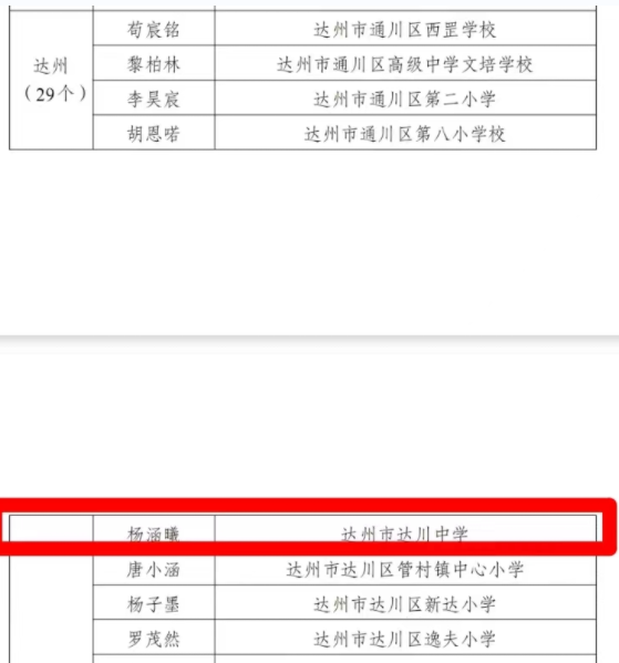 近日,共青团四川省委、四川省教育厅、四川省精神文明建设办公室、四川省少工委联合表彰了2023年度“四川省优秀少先队员” “四川省优秀少先队辅导员” 等,达川中学初二一班杨涵曦同学荣获2023年度四川省“优秀少先队员”的荣誉称号。