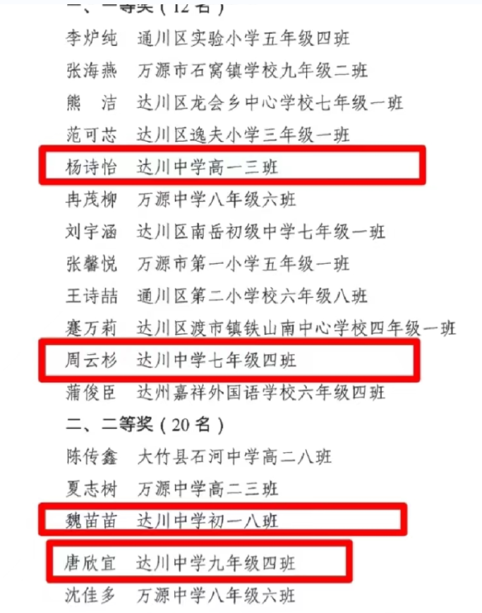 在老师的悉心指导和同学们的踊跃参与下,经过专家评审,达川中学共有七名同学获奖。其中,一等奖2名,二等奖2名,三等奖1名,优秀奖2名,郑泽申、黄龙君、徐亮亮、唐红四位老师荣获“优秀指导老师”称号。