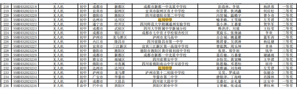 近日,四川省教育信息化与大数据中心公布了2023年四川省信息素养提升实践现场交流展示活动获奖名单,达川中学共有4名学生在展示活动“无人机-初中组”获奖。喻圣皓、王雪瑞同学两位同学获得二等奖,袁雅涵、刘传峰同学获得三等奖。