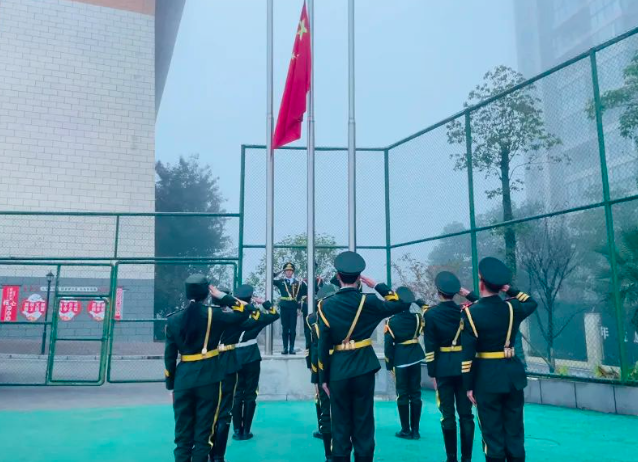 伴随着雄壮的国歌声,鲜艳的五星红旗冉冉升起,全体师生整齐列队,庄严肃立,面向国旗行注目礼!