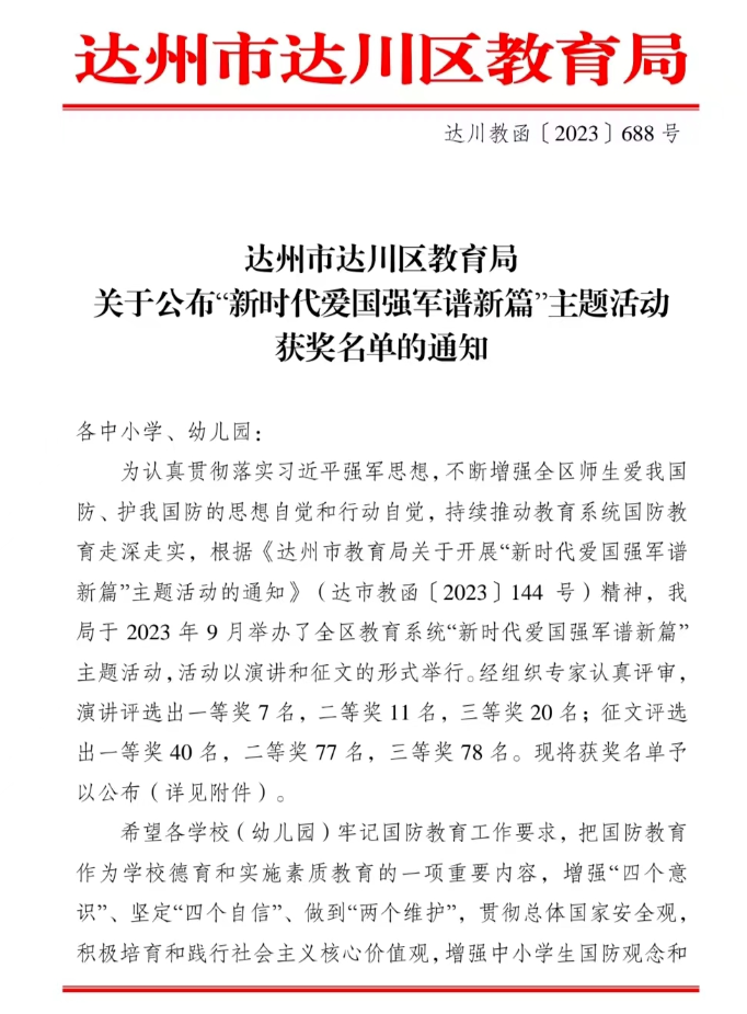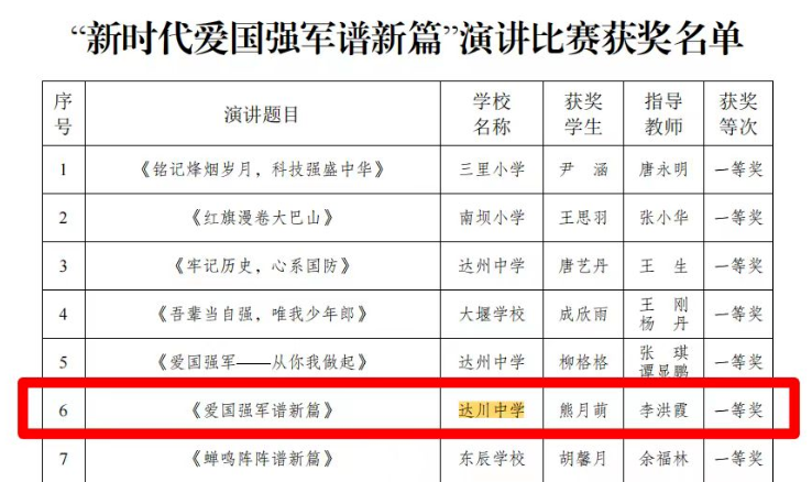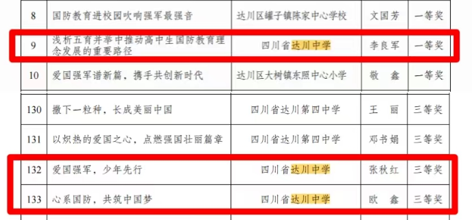 今年9月,达川区教育局举行了“新时代爱国强军谱新篇”主题活动,该活动以演讲和征文的形式进行。在此次活动中,达川中学熊月萌同学获得演讲比赛一等奖,李良军老师的《浅析五育并举中推动高中生国防教育理念发展的重要路径》在征文活动中获得一等奖,张秋红老师的《爱国强军,少年先行》和欧鑫老师的《心系国防,共筑中国梦》获得三等奖。