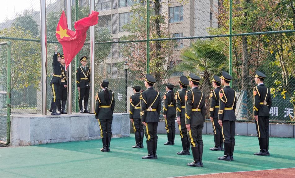 伴随着嘹亮的国歌奏响,五星红旗冉冉升起,随风飘扬。全体师生面向国旗庄严肃立,高唱国歌,并致以最崇高的敬意。