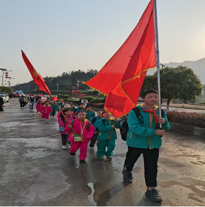 22日早上8:30全校300多名师生齐聚操场,同学校们穿着校服、戴着红领巾、路队帽,高举班牌、队旗整装出发。一路上,金黄的油菜花,粉红的桃花、雪白的李花交替着呈现师生们面前,同学们有说有笑,同学们一会儿跑,一会儿跳,经过半个多小时的跋涉,到达了目的地。