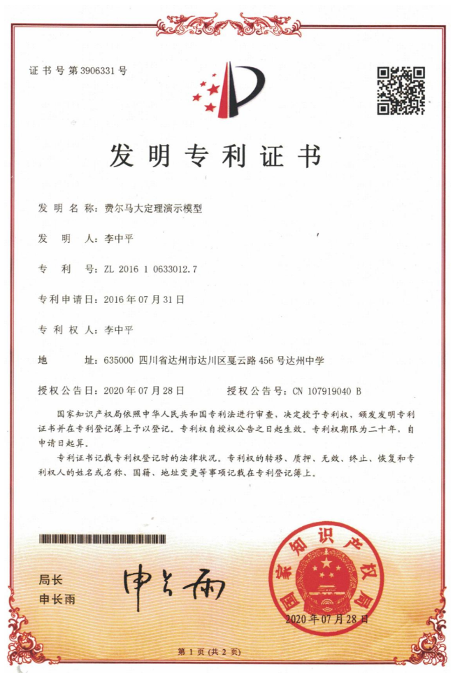 2024年1月,四川省知识产权促进中心与四川省教育厅、四川省科学技术协会联合评定,确定了30所学校为“十四五”第三批中小学知识产权普及教育示范学校,四川省达州中学榜上有名。 部分专利证书 近年来,达州中学高度重视知识产权普及教育,为全校教职员工购买《知识产权基础教程》等书籍,广泛开展知识产权普及教育培训工作。目前,师生已取得实用新型专利和发明专利各12个,版权证书8个,各类工程和数学的科学教育模型40多个,储存专利技术30多项。(钱中山)