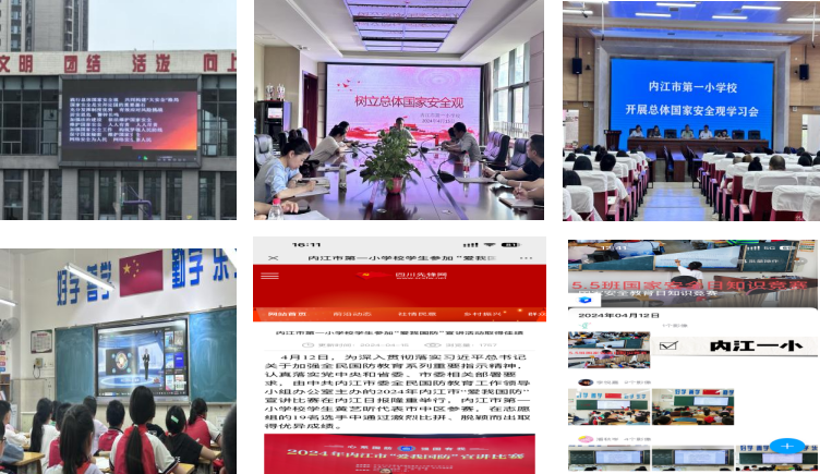 为了贯彻落实全体师生树立总体国家安全观,4月15日“国家安全教育日”,内江市第一小学校分别召开支委会、党员大会、教师大会等进行全面深入的学习,以班级为单位利用夕会、班会自行组织学生学习国家安全日相关内容、组织学生参与国家安全教育知识竞赛、集中收看四川省播出的“同上一堂国家安全教育课”,内江市第一小学校学生代表参加内江市2024“爱我国防”宣讲比赛并取得佳绩,同时在校园大屏上播放国家安全宣传标语。