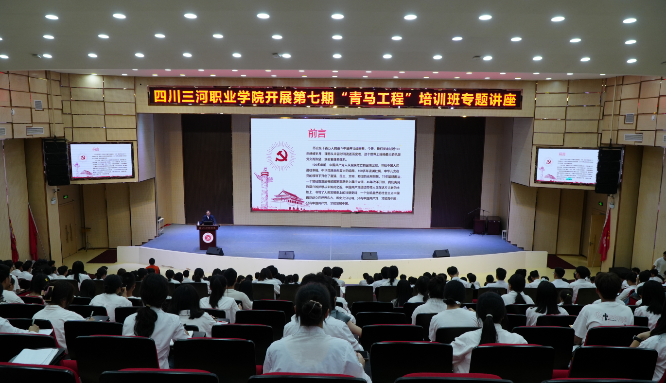 近日,四川三河职业学院党委书记叶昌伦教授在学术报告厅为第七期“青马工程”培训班学员讲授题为“牢记党的光辉历程”的思政课。学校团委副书记巩娜主持,第七期“青马班”全体学员、班团支部书记300余人参与。