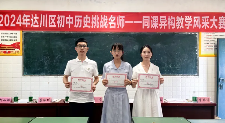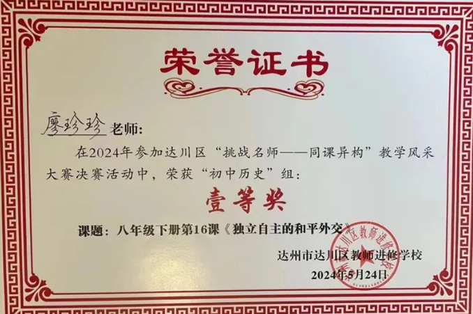 为深入推进课堂教学改革,积极探索新的教学方法,提升学科教师专业水平,锻造高素质教师队伍,发挥“三名工作室”的示范引领作用,2024年5月24日,达川区教师进修校举行达川区初中历史“同课异构--挑战名师”风采大赛,达川中学廖珍珍老师荣获一等奖。