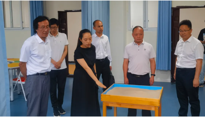 考察组一行首先参观了校园,对学校整体校园环境、基础条件等做了简要了解,并对图书室、电子阅览室、创客空间等建设项目场地作了实地考察。在项目规划现场,考察组一行详细了解了设计布局、周围环境、配套设施等情况,邱勇、代旭东等对现场设计构造、功能区分布等分别做了详细介绍。随后,一行人参观了学校心理健康中心,对先进的设施设备给予了充分肯定。在专职心理教师的介绍、引导下,大家对沙盘室、咨询室、宣泄室、数据分析室的功能和使用情况做了了解。
