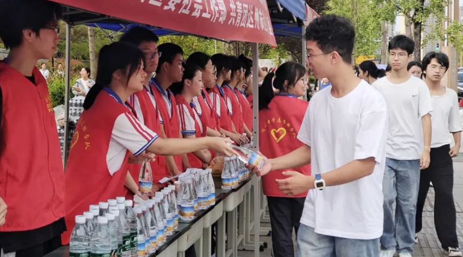 高考期间,学校搭建了志愿者服务点,组织志愿者在考点内外开展志愿服务。“你好,这里有免费的矿泉水和防暑物品”,身着红马甲,手拿矿泉水、药品的志愿者们面带微笑,递给过往的考生和家长,并不断为考生们加油打气,送上美好的祝福。
