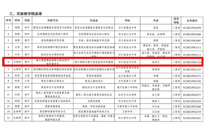 近日,达州市教育局公布了2023年“基础教育精品课”省级获奖名单和达州市“课堂教学大比武”暨基础教育精品课遴选获奖名单。达川中学共有四位老师获奖。庞清文老师的《建立减数分裂中染色体变化的模型》荣获省级“实验教学精品课”二等奖和市级“基础教育精品课”一等奖,倪利佳老师的《桂枝香·金陵怀古》、刘小丹老师的《算术平方根》、刘海霞老师的《Jnit6 I'm going to study computer science. Section F 4-Self Check》分别获市级“基础教育精品课”三等奖。
