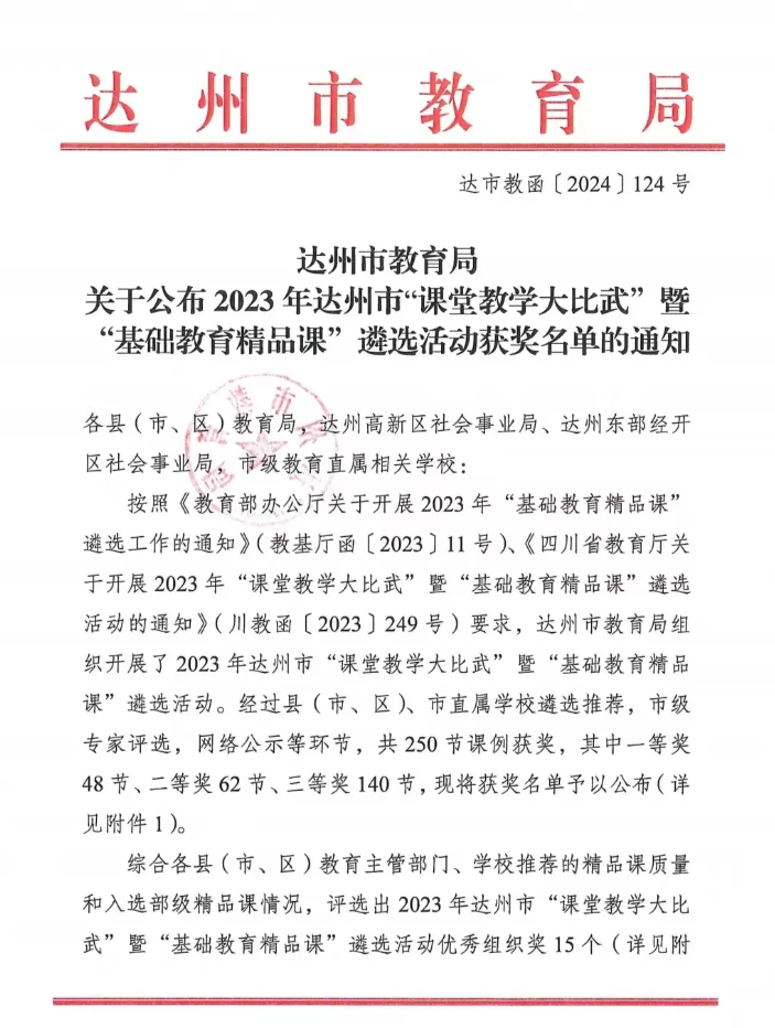 达川中学教师在2023年“基础教育精品课”中获省级、市级奖