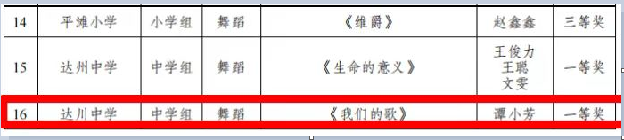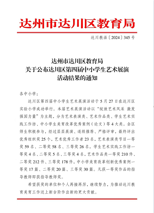 近日,达川区第四届中小学生艺术展演活动评选结果揭晓,达川中学积极组织并选送优秀节目、作品参赛,师生喜获多项佳绩且学校荣获优秀组织奖。其中,表演类节目获得2个一等奖,1个二等奖,学生艺术作品获得4个一等奖,4个三等奖。教师艺术作品获得3个一等奖,2个三等奖。李琳老师荣获本次活动“优秀工作者”。