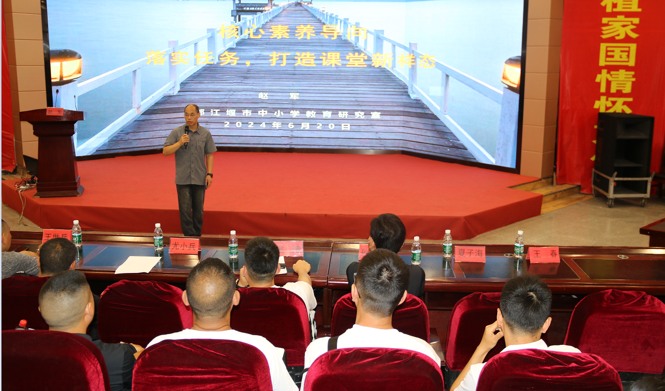 在理论培训现场,都江堰市中小学教育研究室体育教研员赵军老师应邀为三个工作室举办了主题为《核心素养导向