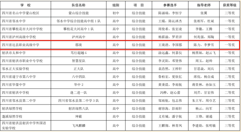 四川省达县职业高级中学学生在四川省机器人大赛中荣获一等奖